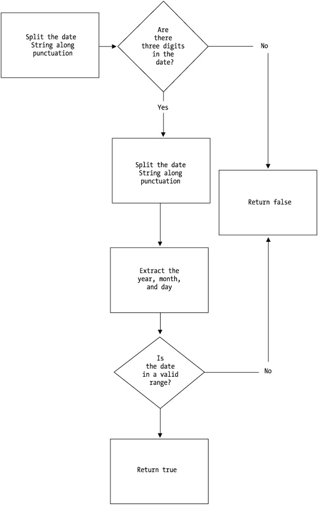 Wait a minute—I wonder if there's an easier way. What if I used the String.split method around the punctuation and extracted the date from the remaining digits? Then I could just use straight Java code to validate the actual date. To do that, I'll need something like this: