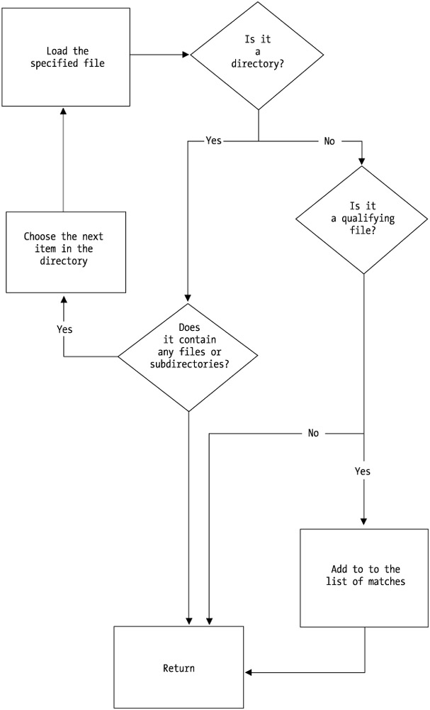 In principle, searching a directory for a file that matches a particular pattern is fairly easy. I already have a mechanism in place to search a file, so all I have to do is search a list of files. As you can see in Figure 5-3, the algorithm is recursive.